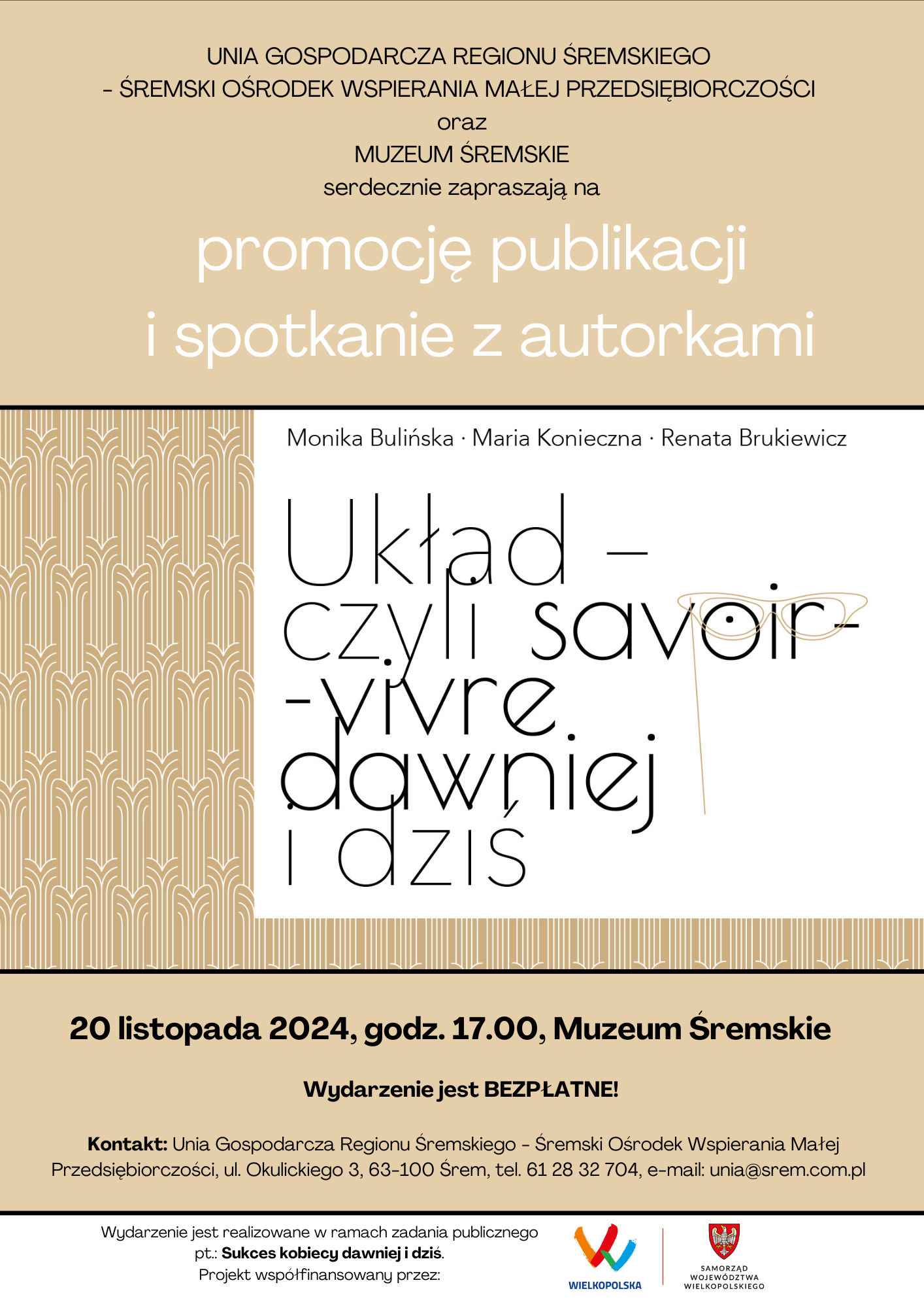 20 listopada br. o godz. 17.00 w Muzeum Śremskim w Śremie odbędzie się promocja nowej publikacji pt.: "Układ - czyli savoir-vivre dawniej i dziś". Zawiera ona krótki opis projektu "Sukces kobiecy dawniej i dziś", wspomnienie o Anieli Robaszyńskiej i przepisany w oryginalnym języku jej zeszyt pt. "Układ" opisujący zbiór zasad i dobrych manier w XIX/XX w., a także krótkie komentarze o współczesnym savoir-vivre.