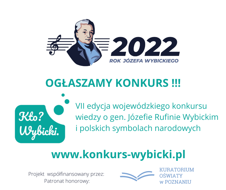 Konkurs realizowany jest w ramach inicjatywy „Wybicki-REAKTYWACJA VIII”, odbywa się pod honorowym patronatem Wielkopolskiego Kuratora Oświaty i przy współfinansowaniu Kuratorium Oświaty w Poznaniu. Na zwycięzców czekają atrakcyjne NAGRODY!!!