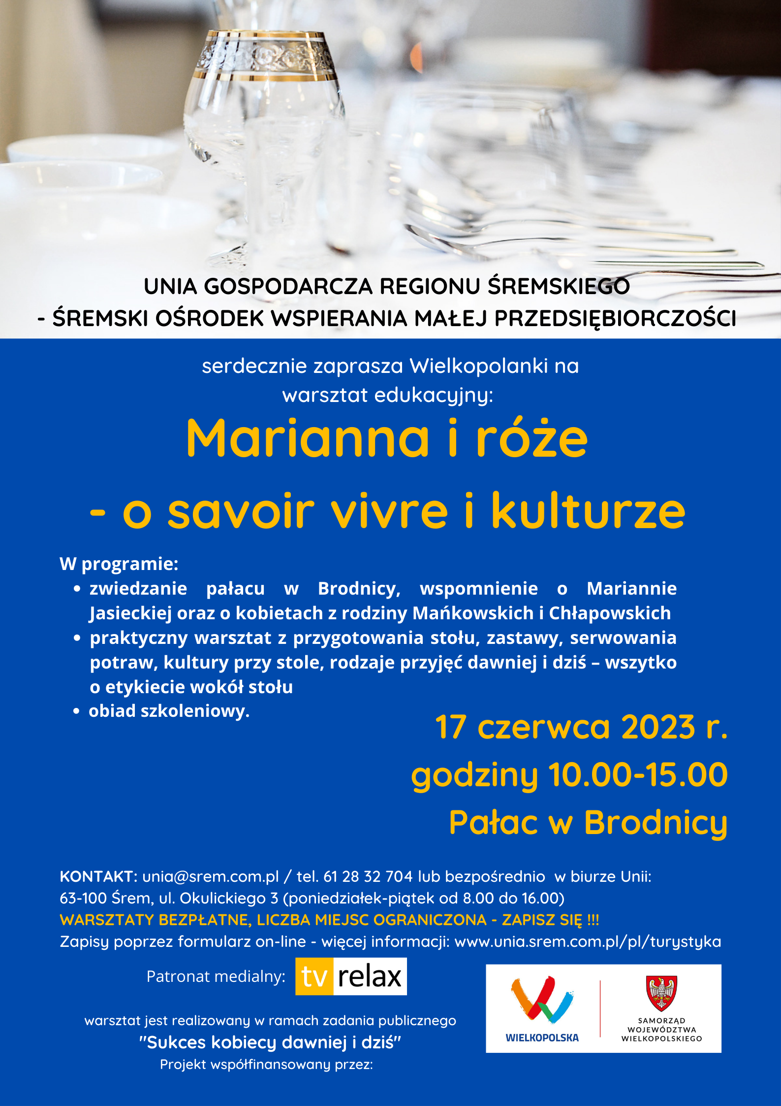 Serdecznie zapraszamy Wielkopolanki na warsztat edukacyjny "Marianna i róże – o savoir vivre i kulturze", który odbędzie się w dniu 17 czerwca 2023 r. w godzinach 10.00-15.00 w pałacu w Brodnicy.