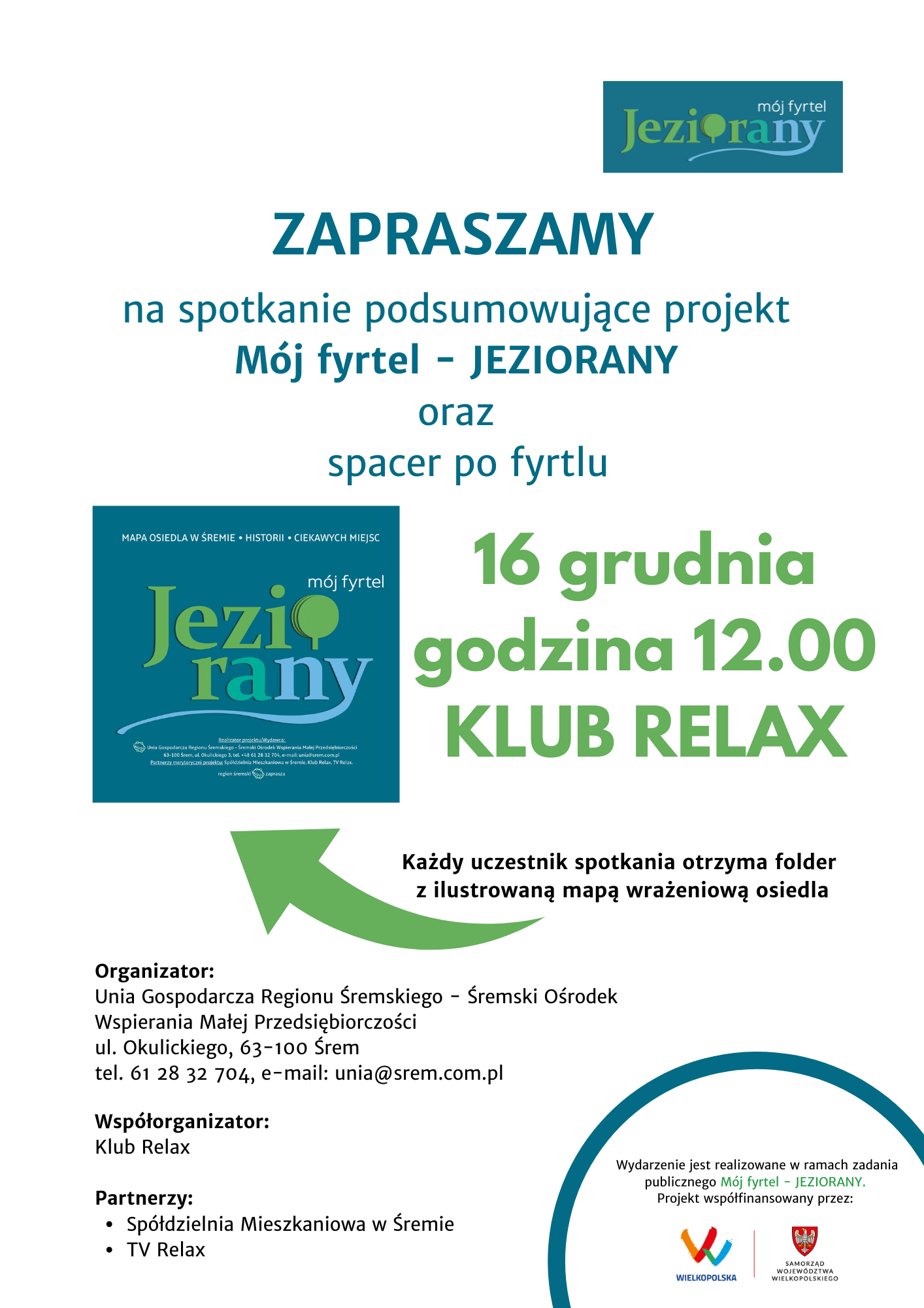 Serdecznie zapraszamy na spotkanie podsumowujące tegoroczną edycję projektu "Mój fyrtel - JEZIORANY", które odbędzie się 16 grudnia br. o godzinie 12.00 w sali Klubu Relax w Śremie (ul. Chłapowskiego 3). Po spotkaniu wyruszymy na spacer po fyrtlu, a każdy z uczestników otrzyma folder z ilustrowaną mapą wrażeniową osiedla.
