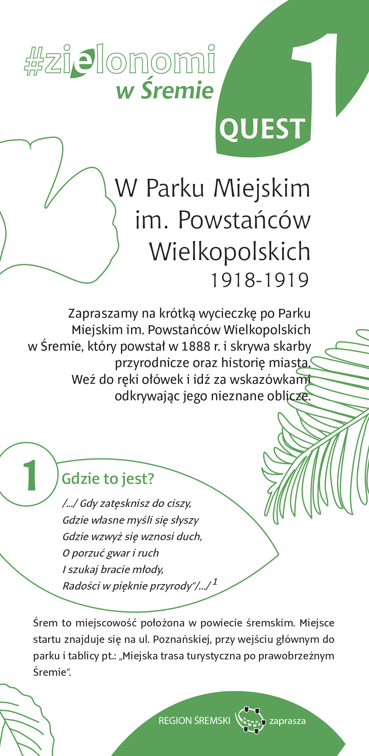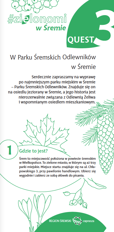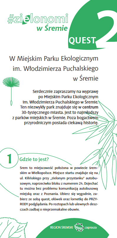 Questy przyrodnicze realizowane przez Unię w ramach projektu "#Zielonomi w Śremie" od października 2022 r. Jego głównym celem jest popularyzacja wiedzy o parkach miejskich w Śremie oraz turystycznych zielonych atrakcjach Regionu Śremskiego.